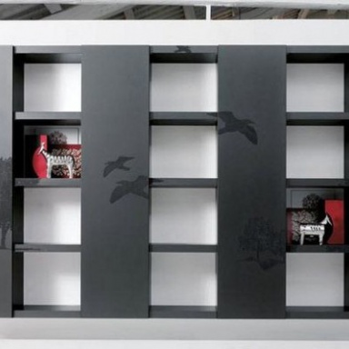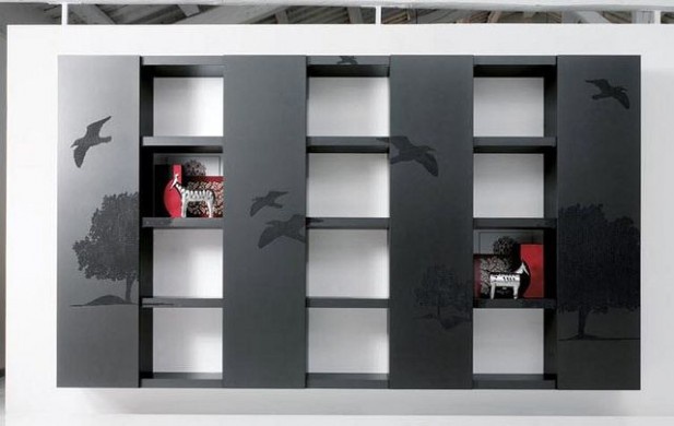 Storage system from the Italian manufacturer Capo D' Opera. Presented to storage system with wing lockers and open shelves. The frame is made from solid wood. The color offered from designer black with prints of trees and birds. The modern style of execution.