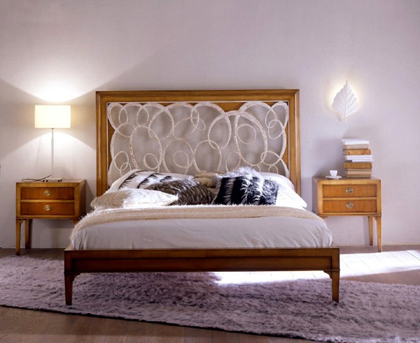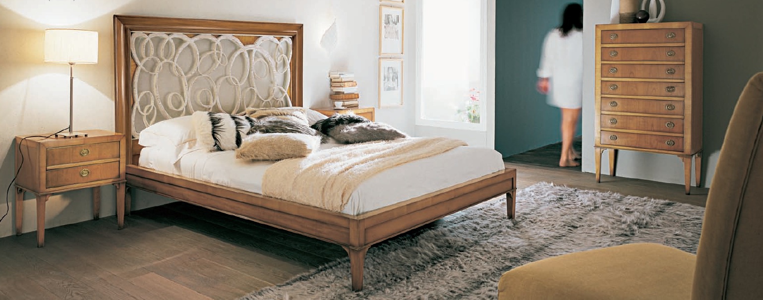 The bed is from Italian manufacturer Bizzotto. Presents a model of double bed with carved back. Finishing in the combination of wood tones and a white aged tone or choice from the catalog factory. A modern solution for the interior of a bedroom in classic style.