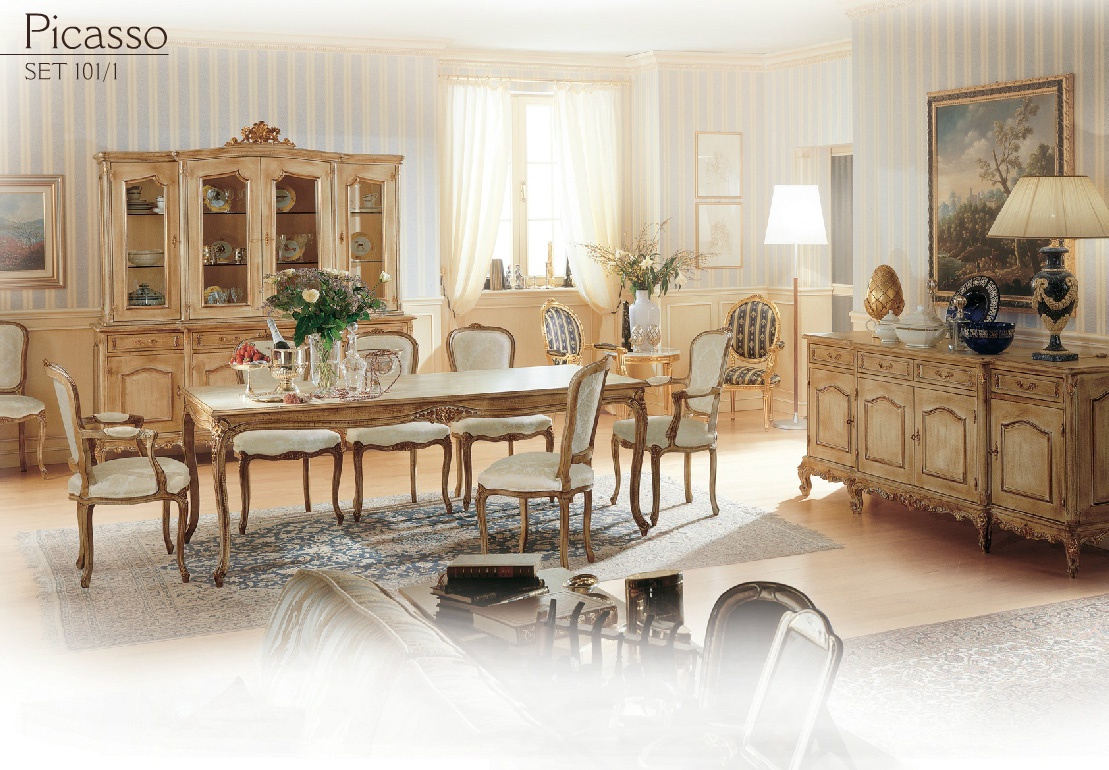 Set for the dining room Picasso from the Italian manufacturer Angelo Cappellini. Set includes dining table rectangular chairs with or without armrests, a snack bar. The furniture is made of solid wood. The upholstery of the chairs - the fabric is from a range of companies. Finish - carved/varnish. Colors: natural wood color, white, beige.