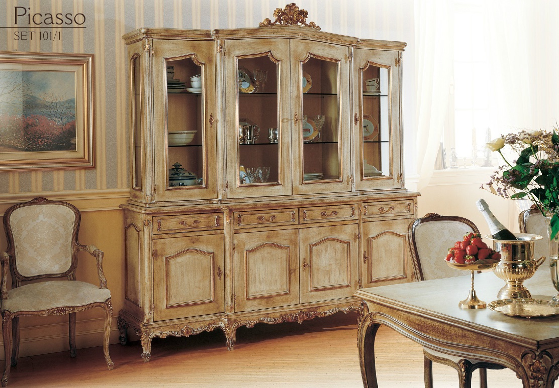 frame: wood doors, shelves: glass accessories: metal details: carved finish: antique |