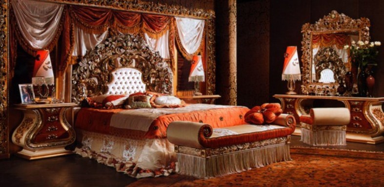 Headsets for bedrooms from Italian manufacturer Cappelletti. Includes double bed, two bedside tables, a daybed, dressing table and stool. Bed with high headboard. The oval bedside tables with drawers. Handles of metal. Frames made of solid wood. Surface models are covered with varnish. Fabric upholstery is decorated with stitch-Capito. Decoration is the decorative carving handmade. Set made in a classic style.
