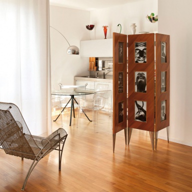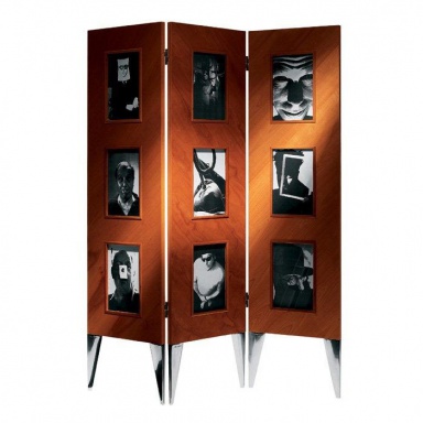 Screen Le Paravent de l'autre from the Italian manufacturer Driade. The frame is made of wood, finished with rich pear. The legs are aluminum. The model with nine frames with lenses. The screen can be placed in any room. Here you can post your favorite photos of friends, family or moments of your travels. Design solution for your interior.
