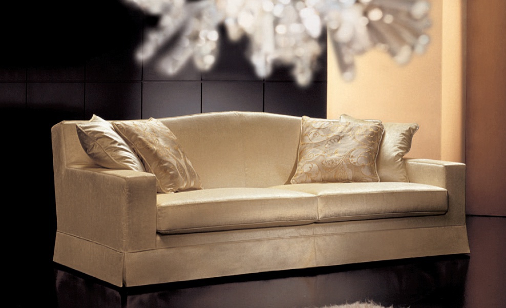 The Valentine sofa from Italian manufacturer Formerin. The frame is made of wood. Upholstered in textile or leather from the company portfolio. Legs - wood. Colors - beige. The backrest is high. The design is complemented by cushions of different shapes and sizes.