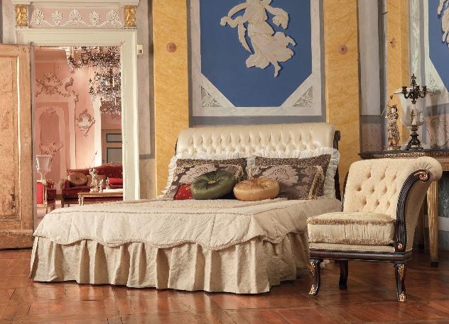 Bed, from the Italian manufacturer Mario Galimberti. The frame is made of drevesiny. Finish - lacquer and carving. Colors - brown and pink. The headboard is high. Upholstery - textiles. Color scheme - white. The model is made in classic style.