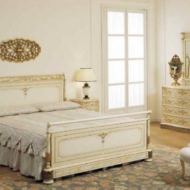 Set for the bedroom Arianna from the Italian manufacturer Asnaghi Interiors. Includes a double bed on legs, bedside tables, chest of drawers and chair. Color scheme in white color with Golden decorative elements. Set made in a classic style.