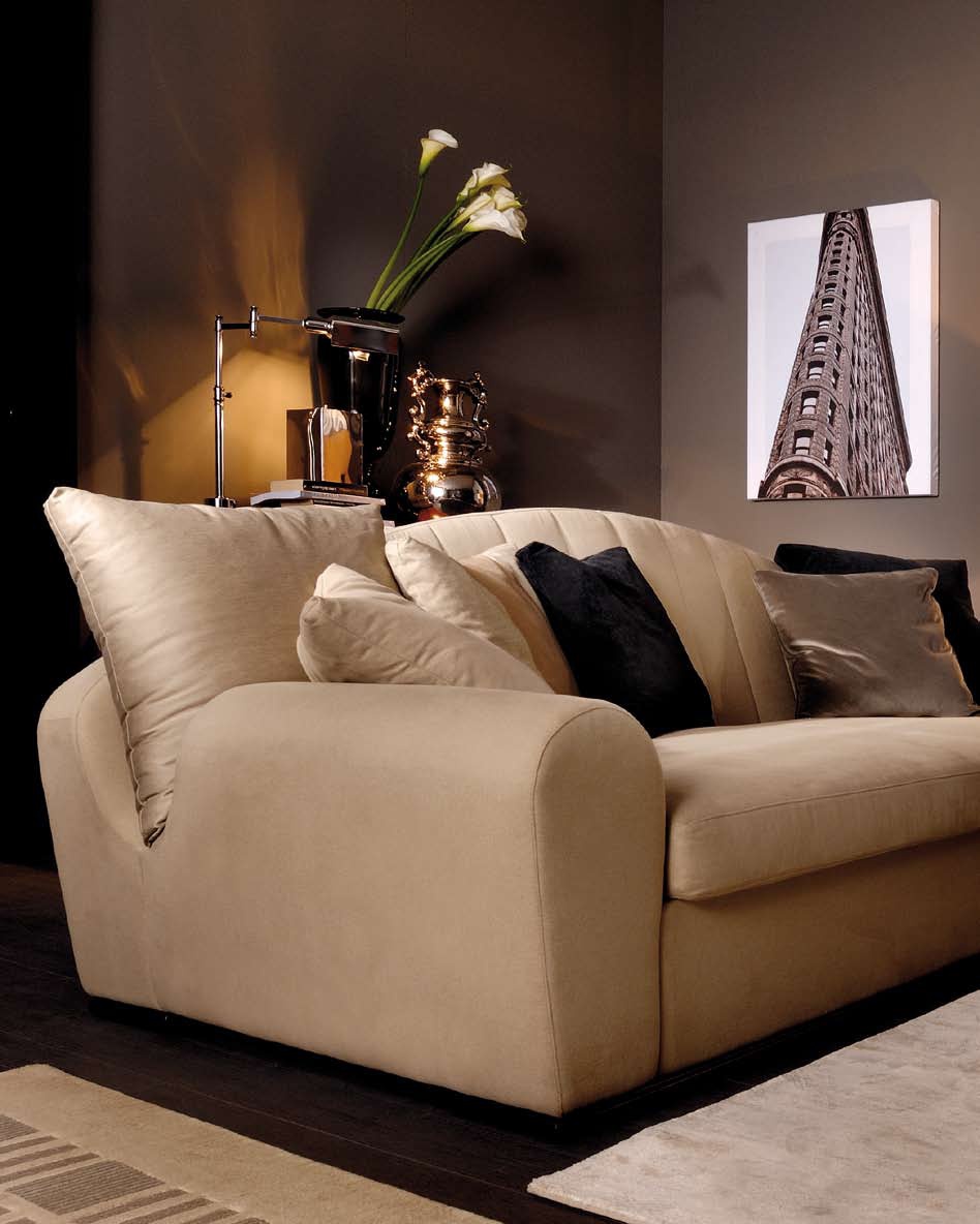 REGENCY three seater sofa from Italian manufacturer MOBILIDEA. A sofa with a high back and soft armrests made in the art Deco style. The company offers two types of upholstery and fine fabrics or leather color mocha. The sofa legs are made of metal. The company offers an interesting option of comfortable sofa, thanks to the openings between the backrest and the armrests. Colors in pastel colors.