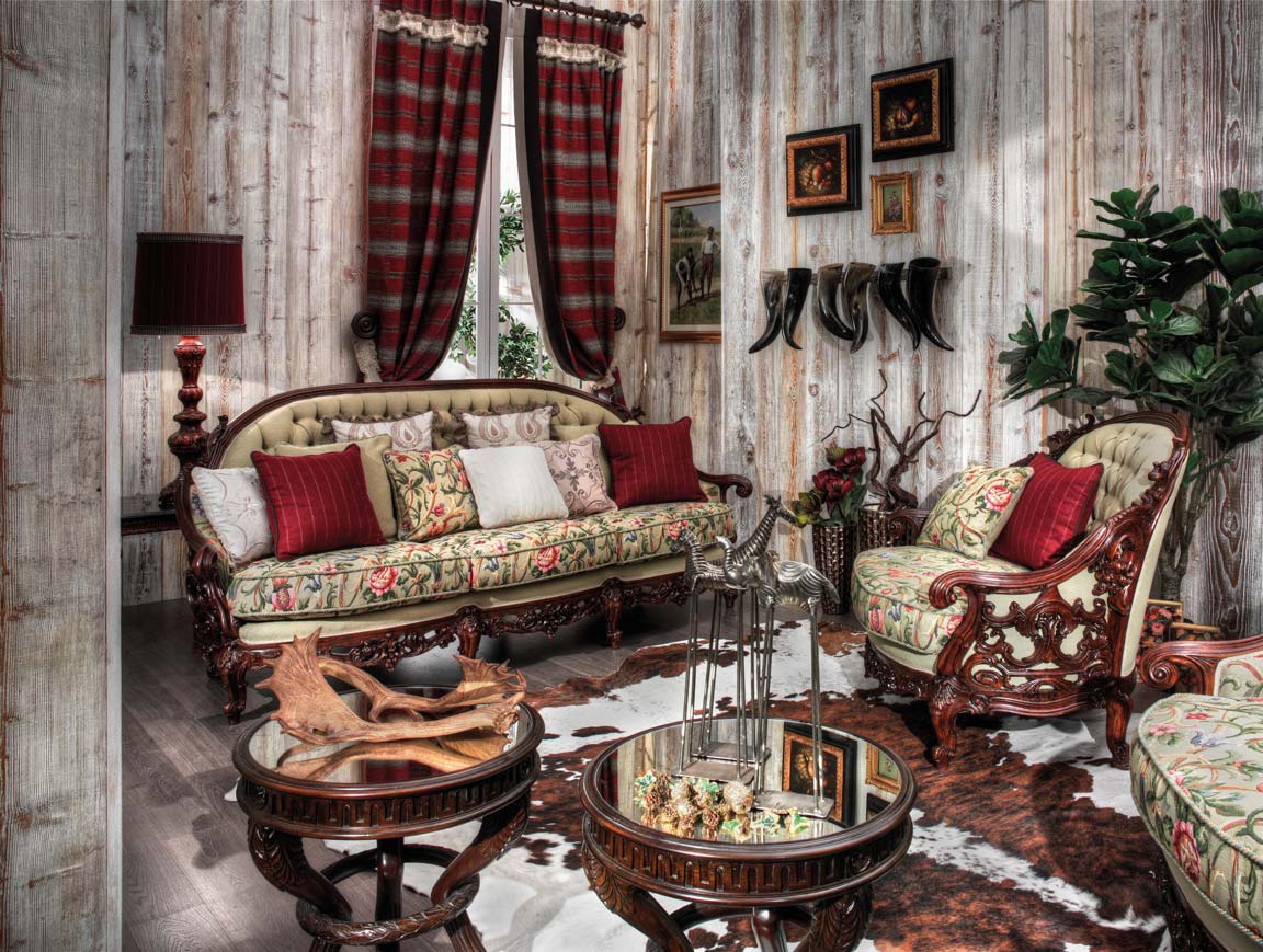Zermatt sofa set from the Italian manufacturer Asnaghi Interiors. Includes chairs, sofa and coffee table. Material - solid wood. Upholstery textiles. The seat cushion is removable. Each model is decorated decorative hand carved.