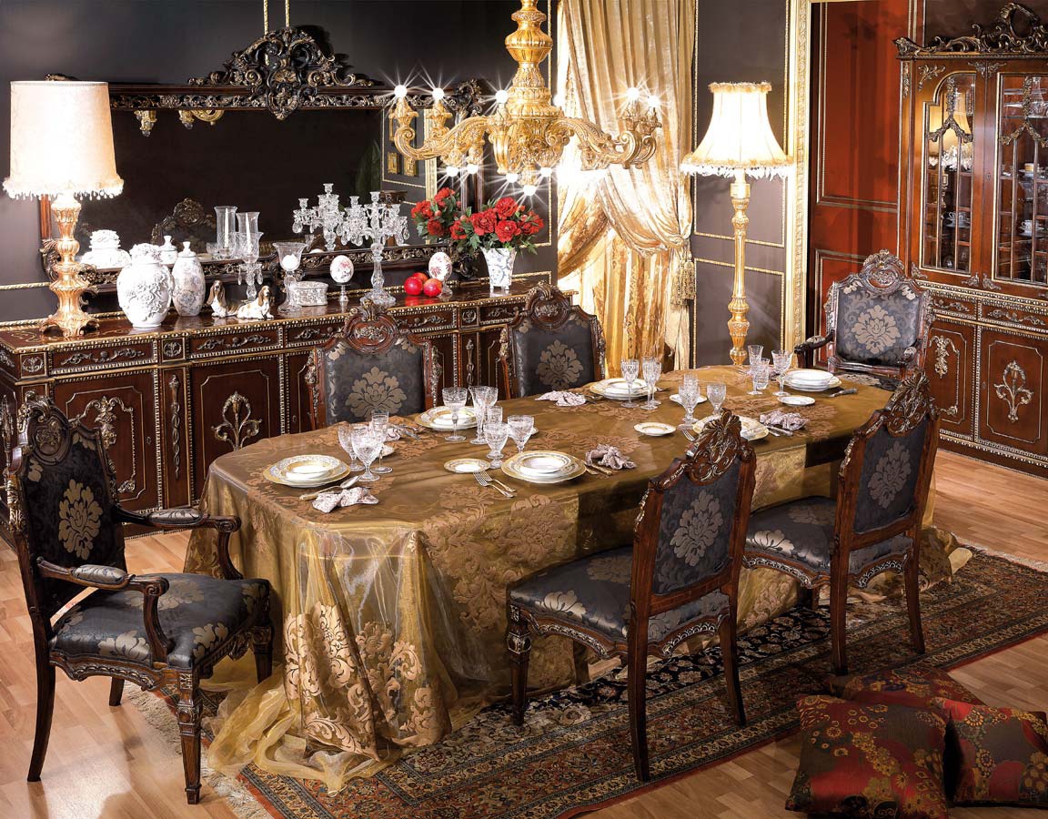 For Kandinsky dining room set from the Italian manufacturer Asnaghi Interiors. Consists of dining table and chairs with high backs. Frames models made of solid wood. Finish - gloss lacquer. Each model is adorned with decorative carvings. Set made in a classic style.