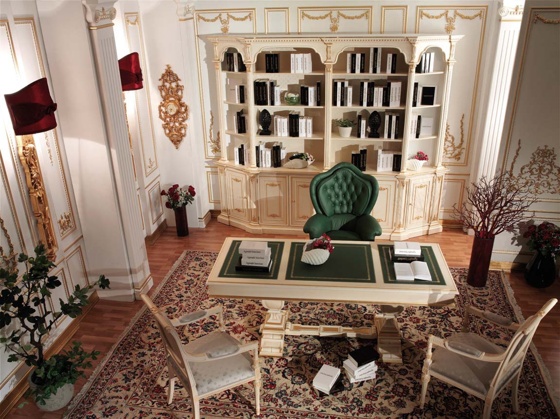Headsets for the office of Brecht from the Italian manufacturer Asnaghi Interiors. Consists of desks, shelving, chairs and chairs with armrests. Frames models made of solid wood. Finish - gloss lacquer. Each model is adorned with decorative carvings. Set made in a classic style.