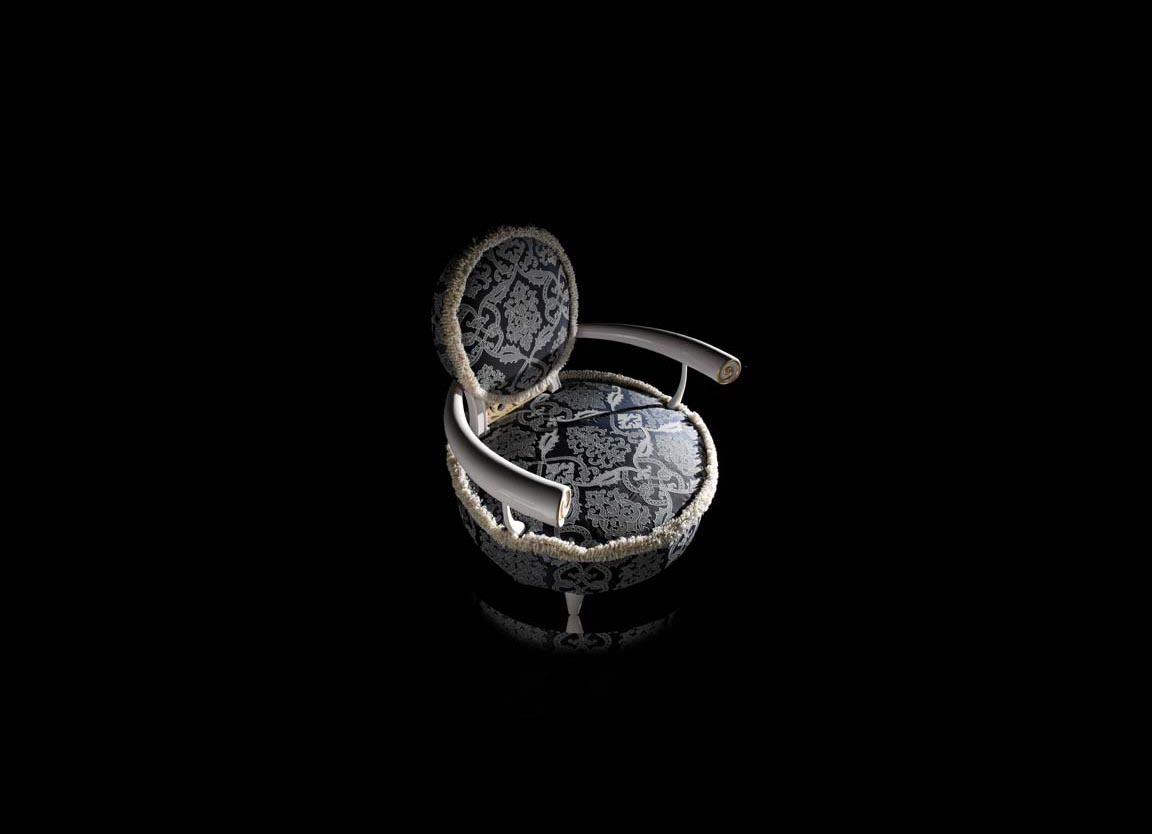 The Comma chair from the Italian manufacturer Asnaghi Interiors. The frame is made of metal in textile finishing. Round chair with low backrest semi-circular armrests. The modern style of execution.