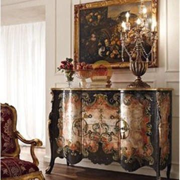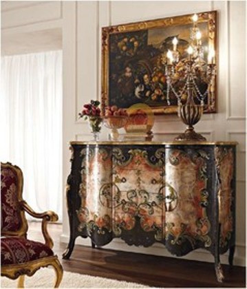 A chest of drawers from the Italian producer Andrea Fanfanii. Model on a low figured legs, the frame is made from solid wood. Decorated with hand painted. Model with shaped hinged doors. Great choice for the bedroom in classic style.