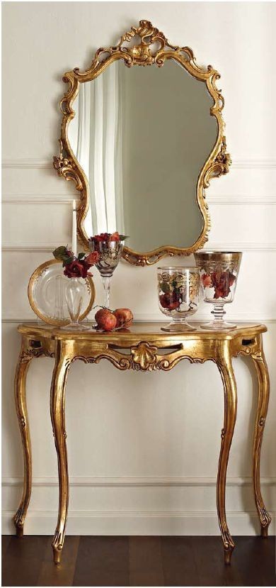 Console from the Italian producer Andrea Fanfani. The console at a high figured legs. The decor is hand-carved. The console is completely covered with Golden paint. A style classic.