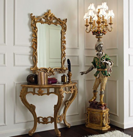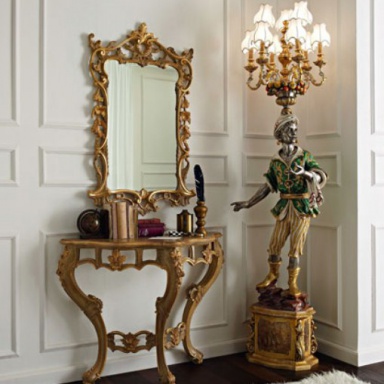 Console from the Italian producer Andrea Fanfani. The console on three sculpted legs. The decor is hand-carved. A style classic.