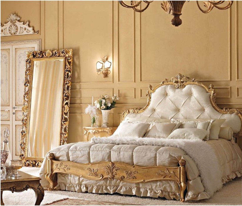 Headsets for bedrooms from Italian manufacturer Andrea Fanfani. Set includes double bed with sculpted headboard, and bedside tables. Frames made from solid wood. Coating Golden color, white textile upholstery. Set made in a classic style.
