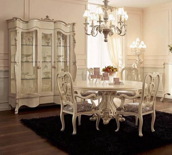Set for the dining room from Italian manufacturer Andrea Fanfani. Set includes round table, dining chairs, sideboard. The furniture is made of natural wood. Chairs upholstery - textiles from a range of campaigns. Shutters and shelves - glass. The finishing - varnish. Swing doors are locked. Colours in stock.