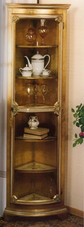 Showcase corner from the Italian producer Andrea Fanfani. Made from solid natural wood. Originality gives a carved wood handmade. Model with glass doors. Colours in stock.