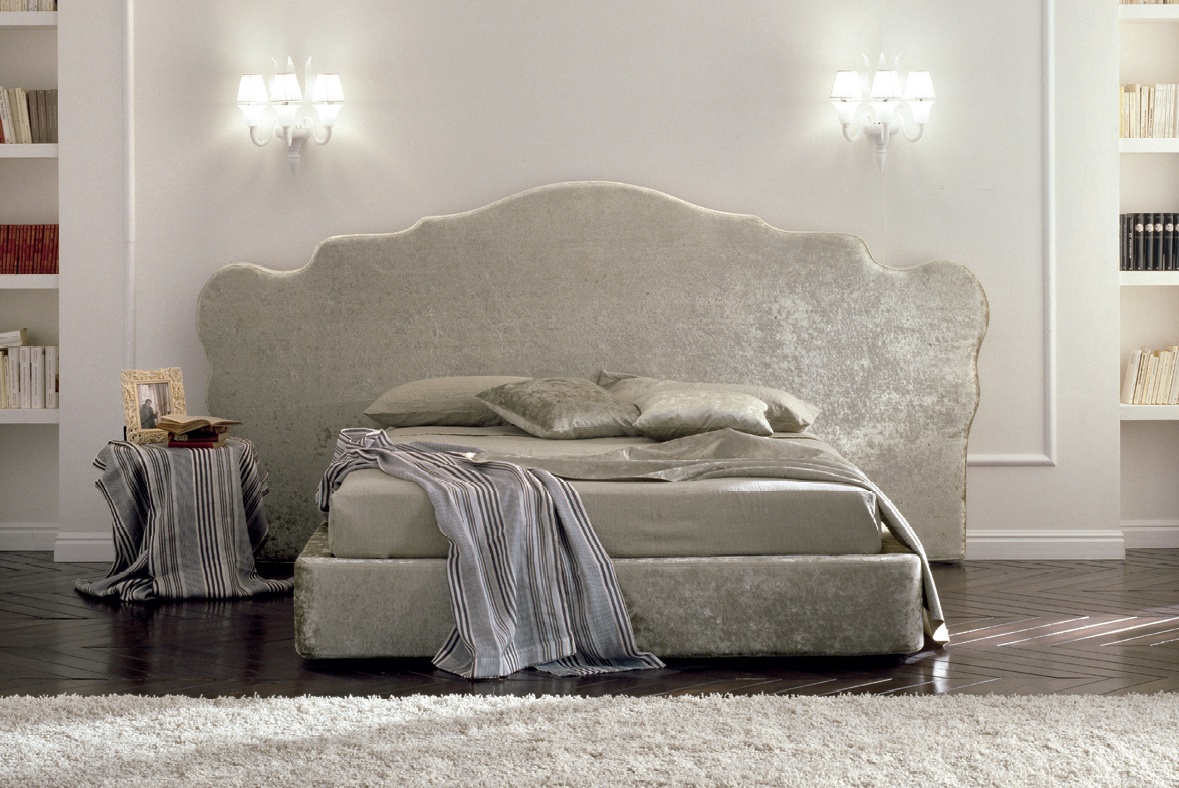 Double bed large Coronas from Italian manufacturer Bolzan. Made in the classic style. Body and legs made of solid wood. Upholstery textile. Colors to choose from the collection of the factory. Decoration is a wide headboard curly shape.