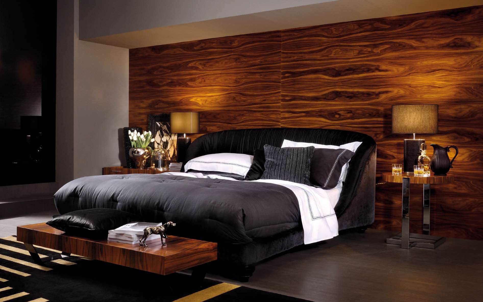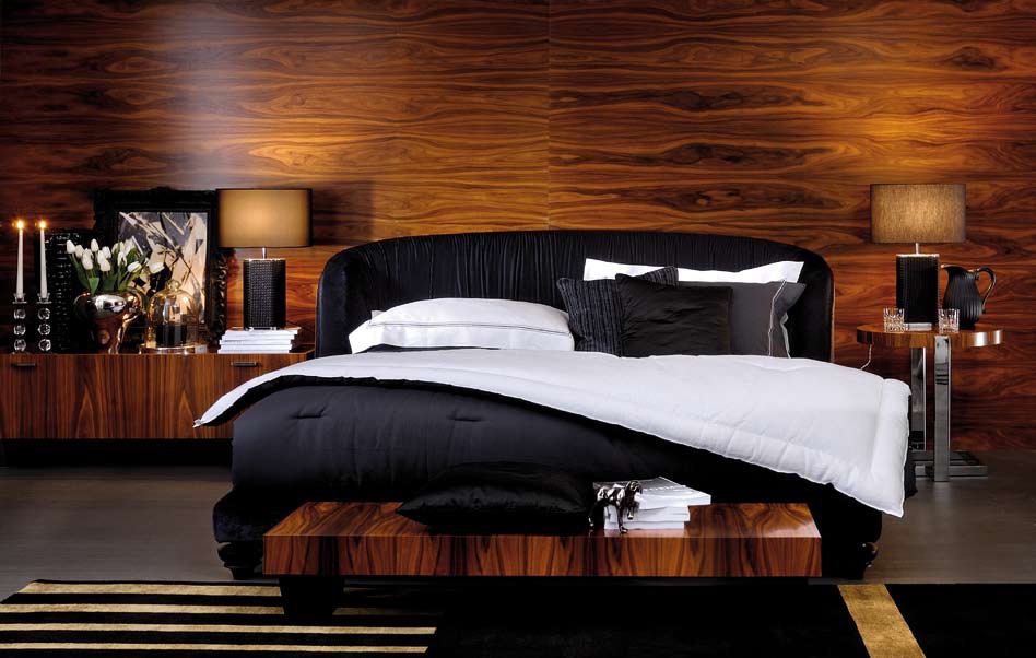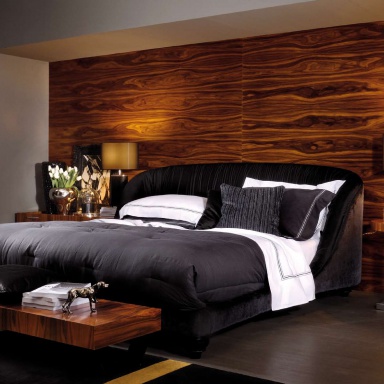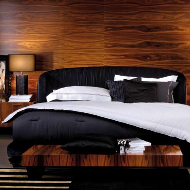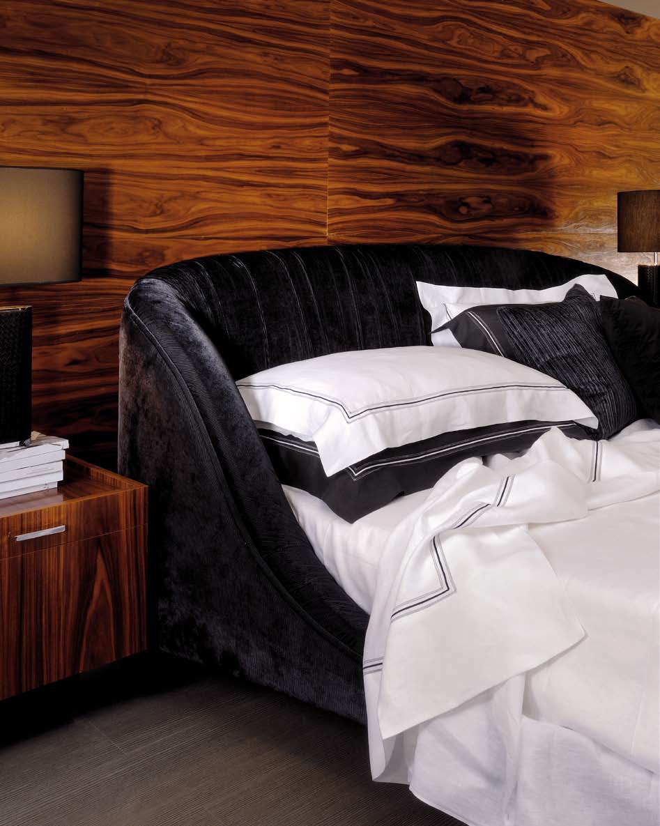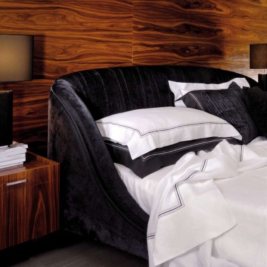 Modern Italian bed with high headboard SHELL branded products MOBILIDEA. The proposed model is very concise form, high headboard. The frame is completely covered with refined material finishes or natural leather dark-colored. Legs are made of solid wood.