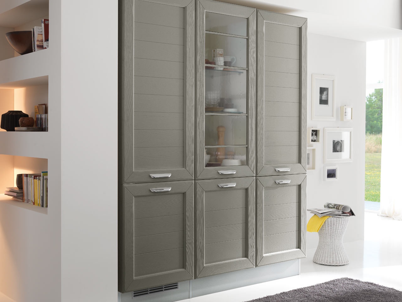 Set for the kitchen from Italian manufacturer Cucine LUBE. Frame of furniture is made of wood and metal. Cabinet doors can made from timber or glass. Massive stick of wood. Headsets are offered in gray. In the presence of a built-in wall extractor fan. Set made in a classic style.