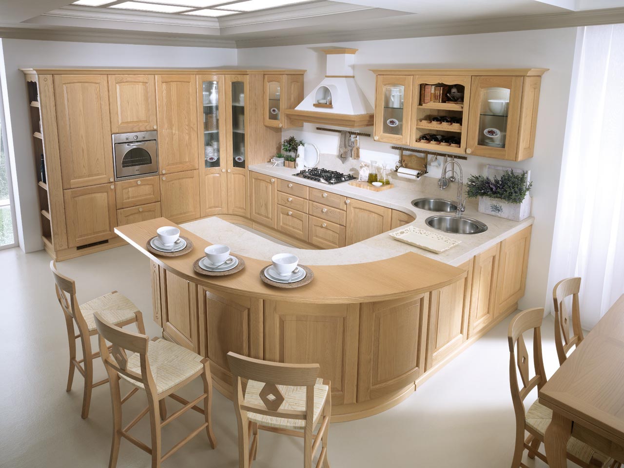 Set for the kitchen from Italian manufacturer Cucine LUBE. Frame of furniture is made of wood. The original solution for the kitchen with a Breakfast bar. The color of light wood. Made in the classic style.