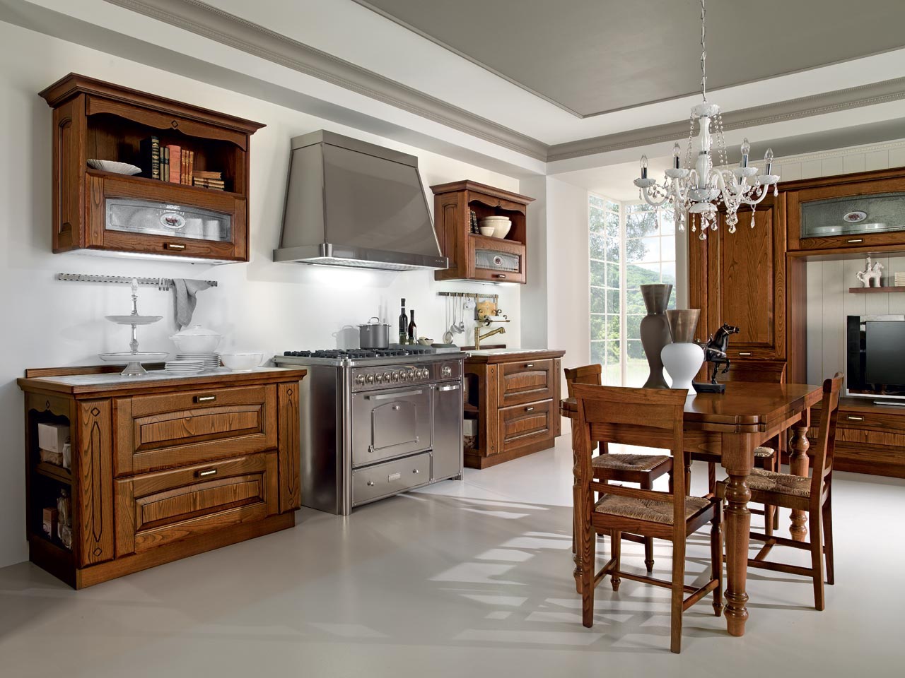 Set for the kitchen from Italian manufacturer Cucine LUBE. The frame is made of natural wood. Cabinet doors made of wood and glass. Hinged hood made of metal. Set is made in classic style natural wood color.
