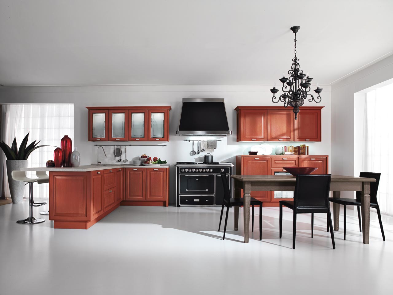 Set for the kitchen from Italian manufacturer Cucine LUBE. The headset frame is made of wood. Cabinet doors made of wood and glass. The presented model wall hoods in black version. Set made in a classic style in a coral color.