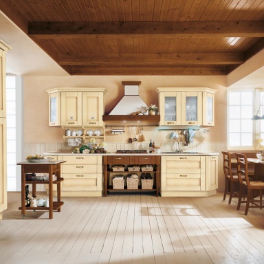 Set for the kitchen from Italian manufacturer Cucine LUBE. Skeleton models made of wood and glass. Cabinet doors made from wood and glass, metal handles. Kitchen color milk color. Set made in a classic style.