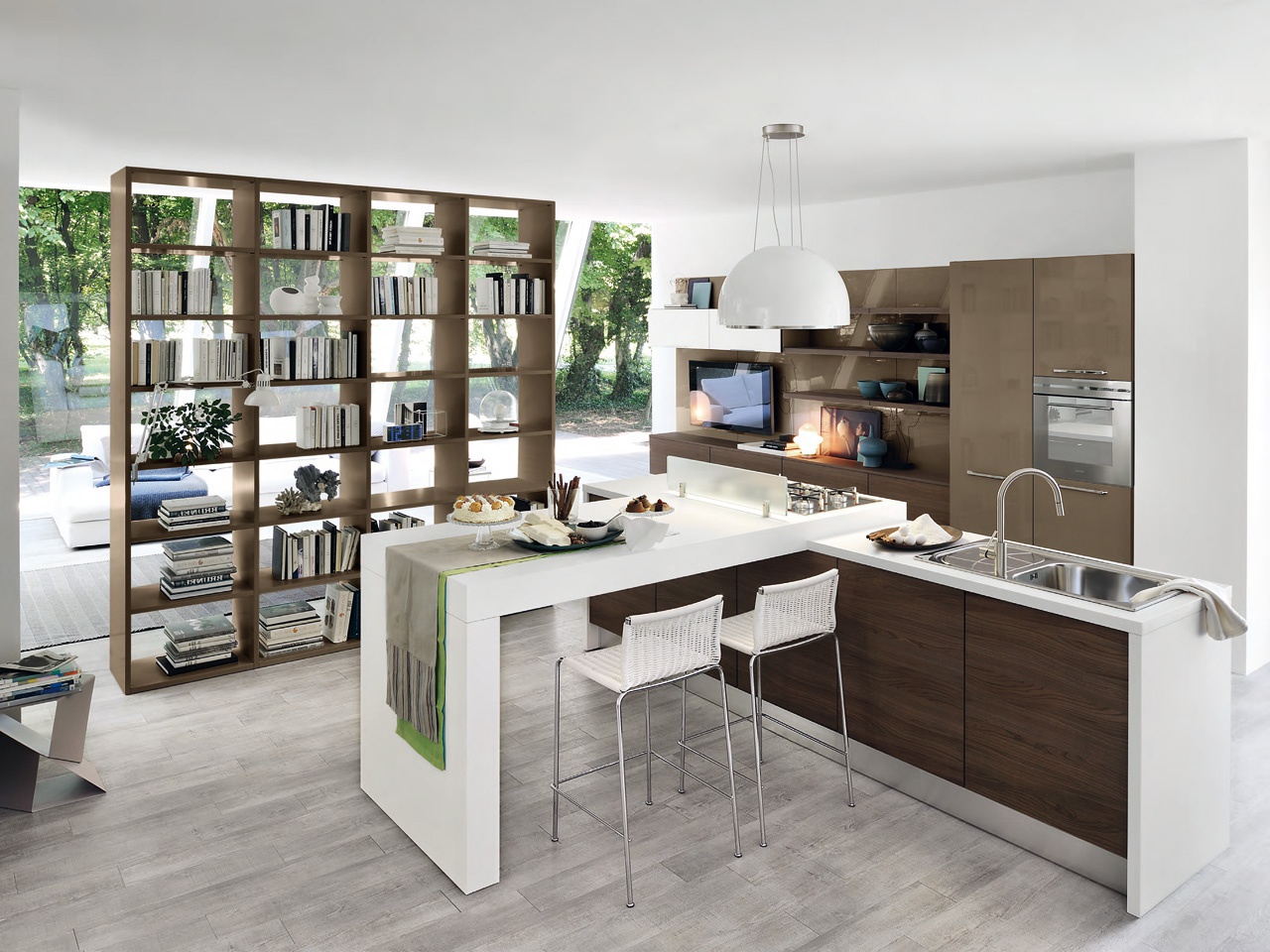Set for the kitchen from Italian manufacturer Cucine LUBE. The frame is made of wood and metal. Cabinet doors can made from timber or glass. The massive handle is made of metal. Offers shelving for books in range with kitchen. Available built-in lighting and extractor fan. Set is manufactured in contemporary style.
