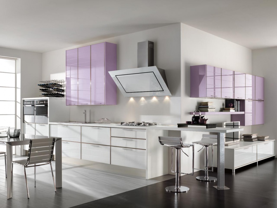 From Italian kitchen manufacturer Cucine LUBE. The frame presents dishes made of particle Board, surface: melamine, lacquer finish. Color in combination of white and Magenta. An excellent model for modern interiors.