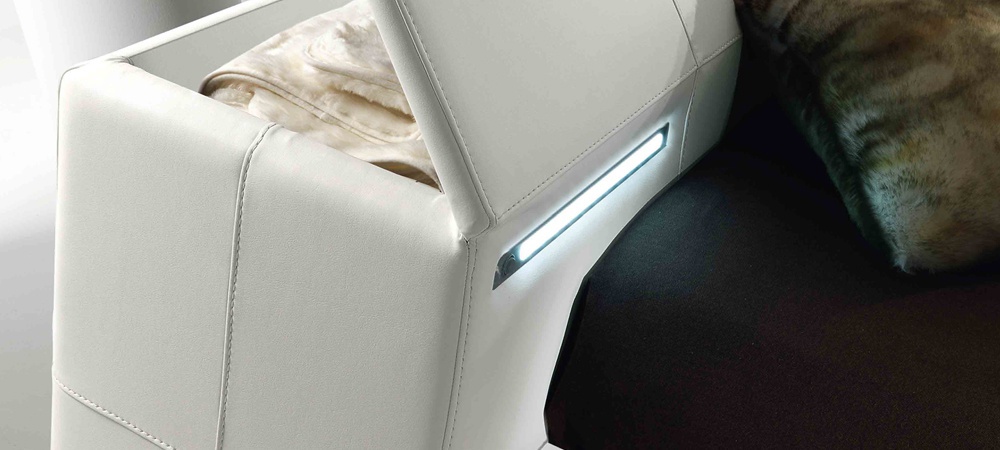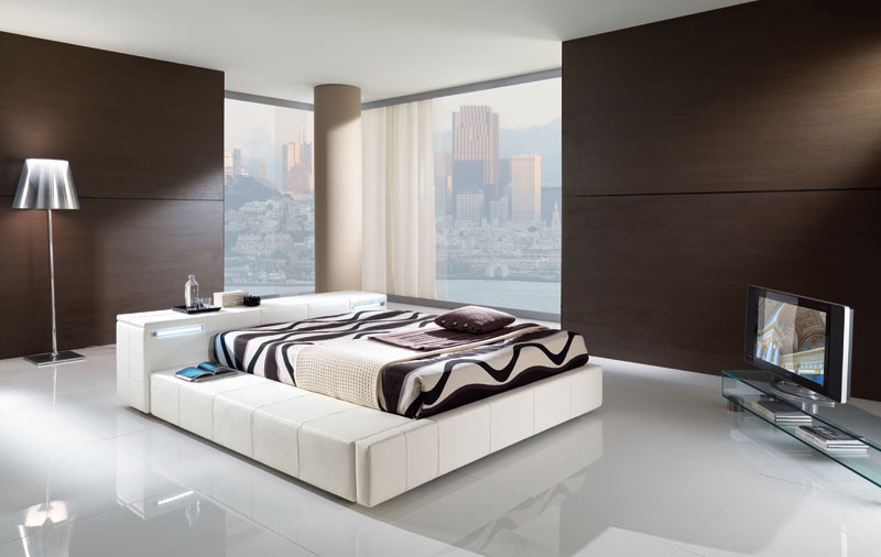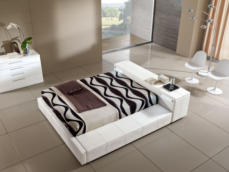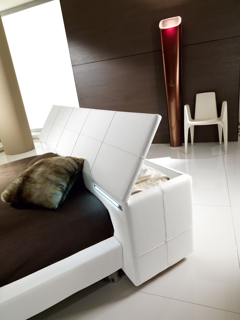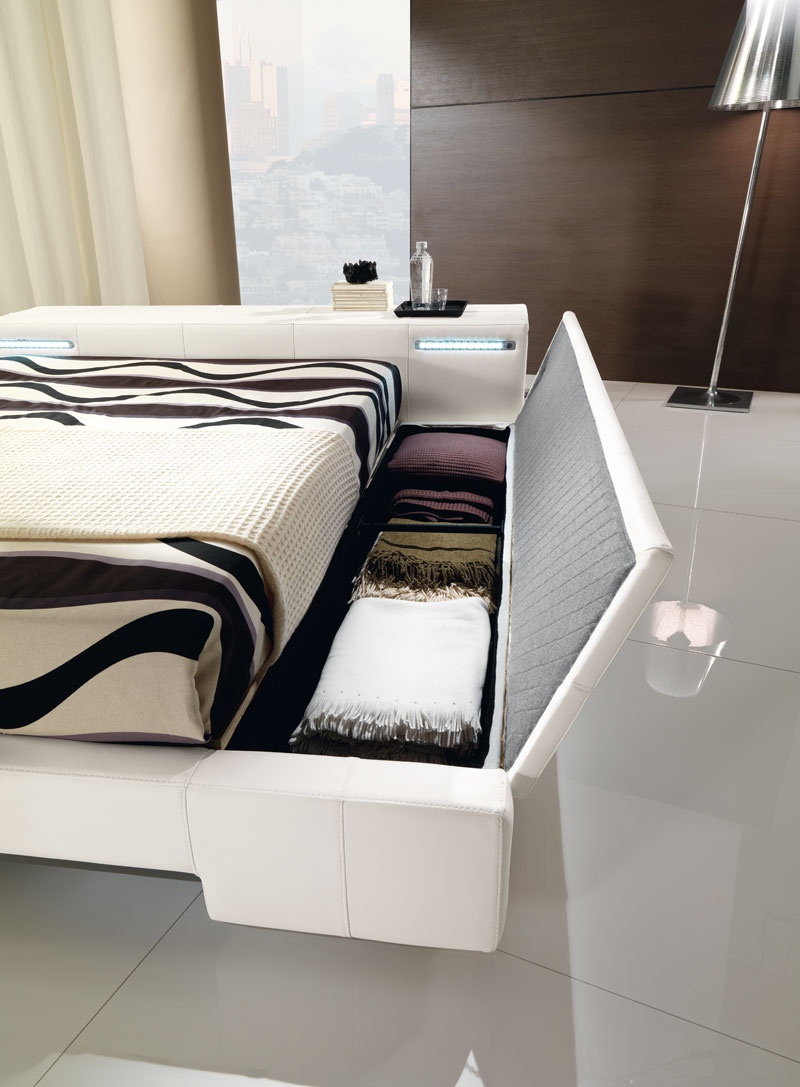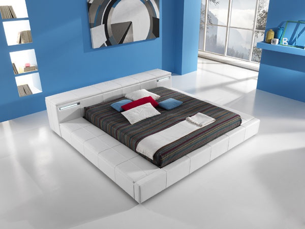Double bed from Italian manufacturer Essepi. The frame is made of wood, filler - polyurethane foam. Low headboard with built-in drawers. The bed is fully upholstered in genuine white leather. The modern style of execution.