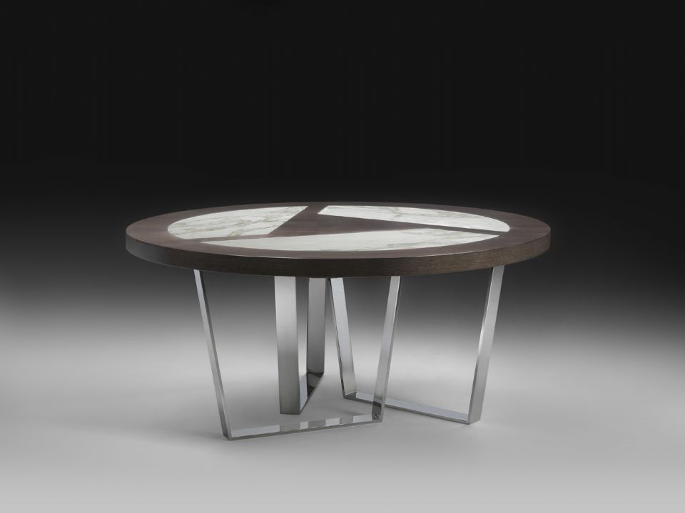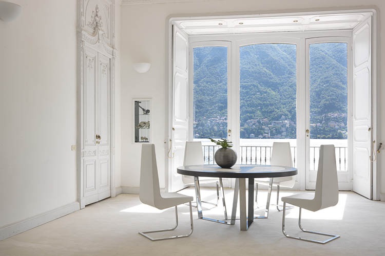 Set for the dining room from Italian manufacturer Klab Design. Chairs on a metal frame with plastic seats and backs. The table leg. table top round. The model is made in a modern style.