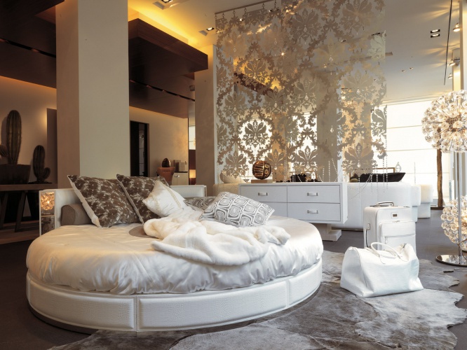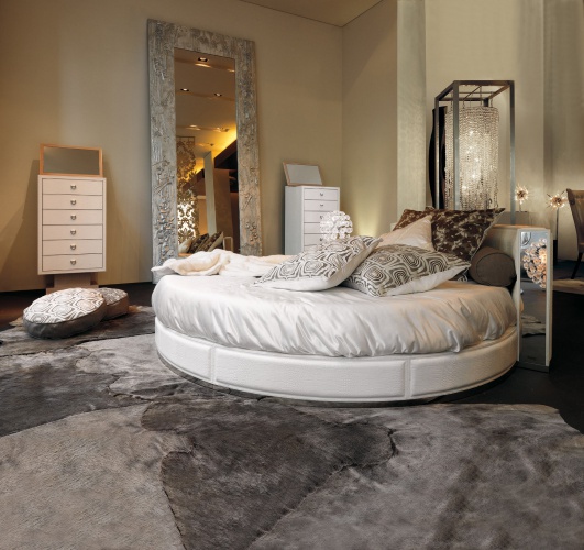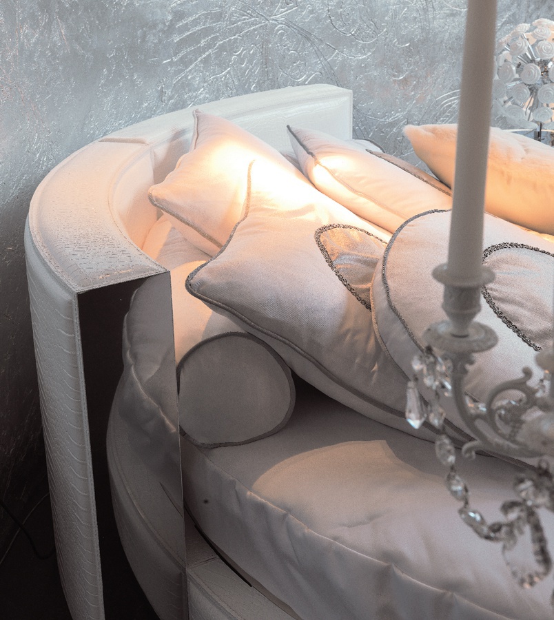 Round bed Venus, from the Italian manufacturer Rugiano. Bed frame made of wood, for upholstery, apply different textures. Colors to choose from the range of the manufacturer. The head semicircular shape can be decorated with mirrored panels. A round bed will add flair to your bedroom in the glamorous style.