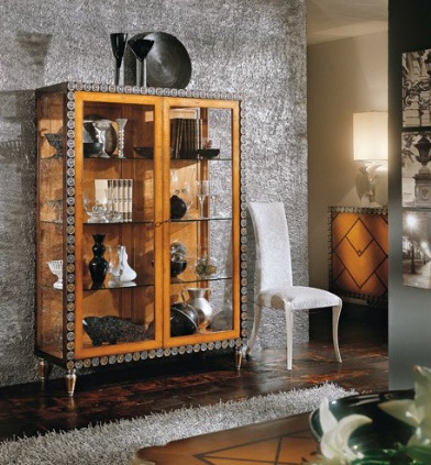 Showcase from Italian manufacturer Bordignon Camillo. Model on figured legs. The frame is made from solid wood. Shutters and shelves made of transparent glass. The doors are locked. The surface is decorated with handmade carving.