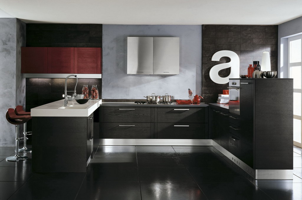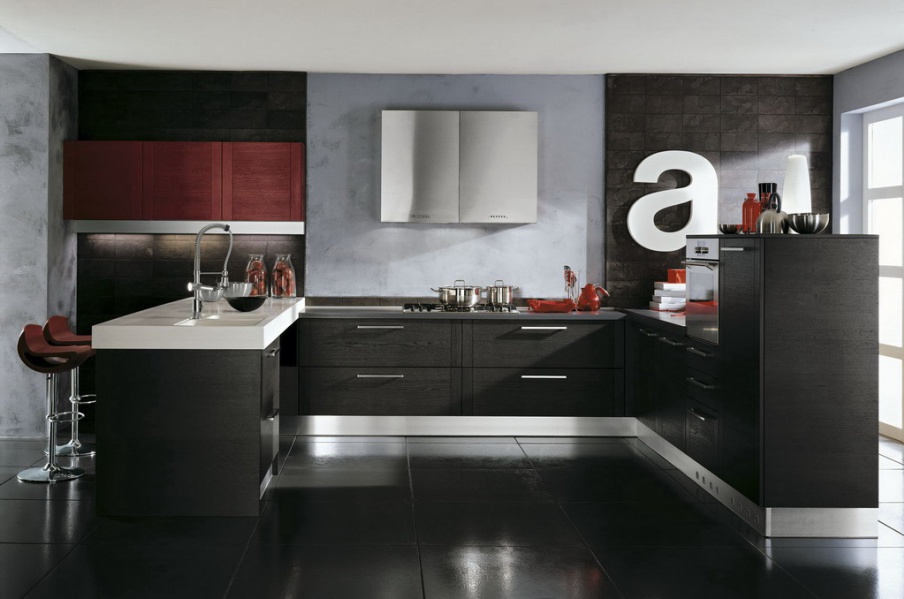Set for the kitchen from Italian manufacturer Astra. Frame of furniture is made of natural wood, metal handles. Kitchen corner with Breakfast bar and overhead cupboards. The color combination of black, steel and red tones. Set is made in modern style.
