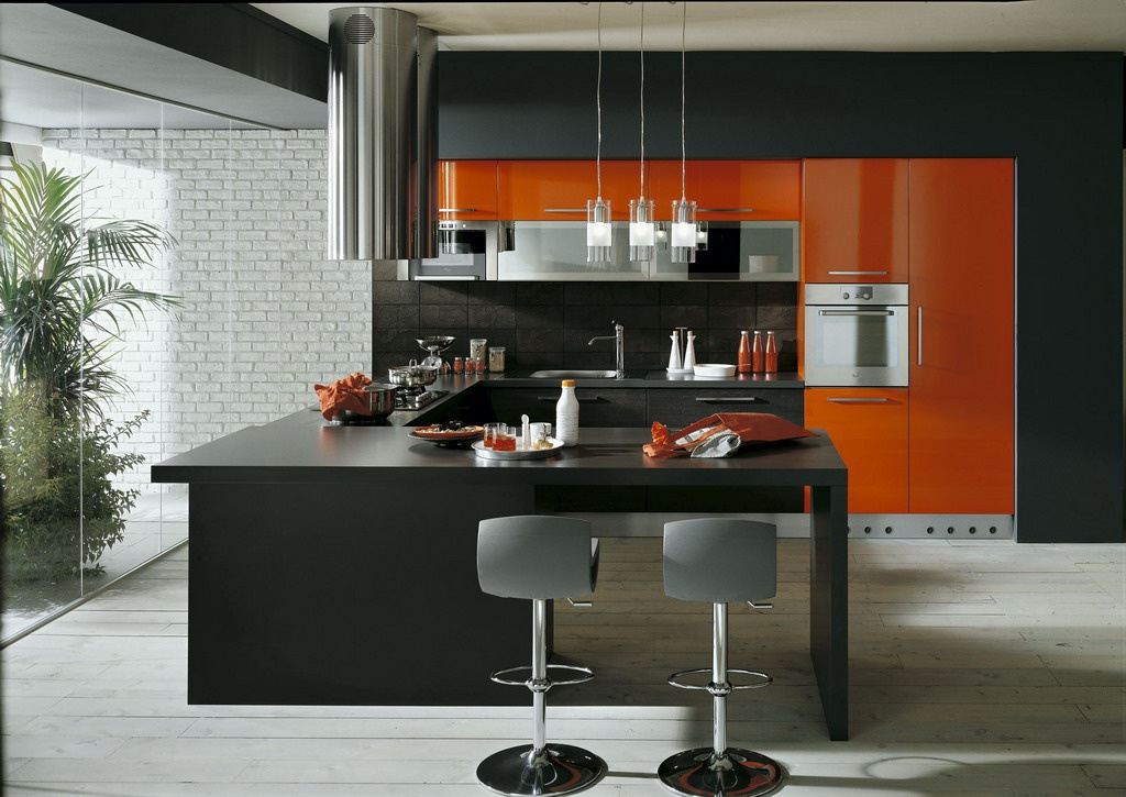 Set for the kitchen from Italian manufacturer Astra. The frame is made from solid wood. The surface of the furniture is treated with varnish from the range of the campaign. Color scheme in grey with orange shades. Set is made in modern style.
