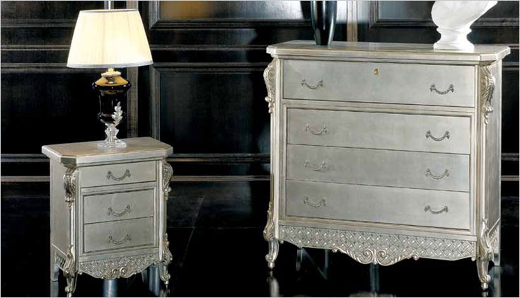 Chest Dorian, from the Italian manufacturer Epoque . The frame is made of wood. Color - silver, in stock. The chest contains four sections. Fittings made of metal. Finish - gloss lacquer and retina work. The model will perfectly complement a classical interior.