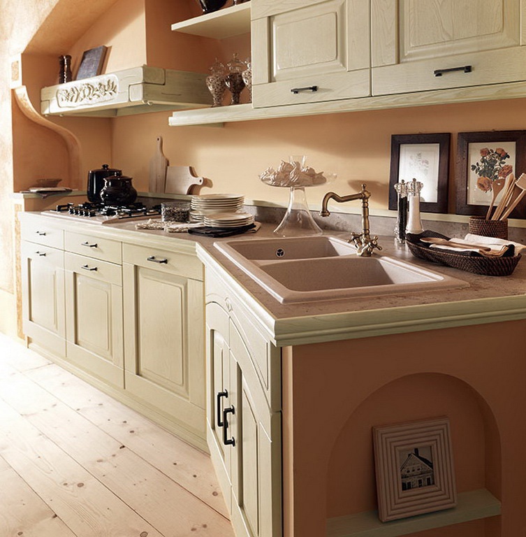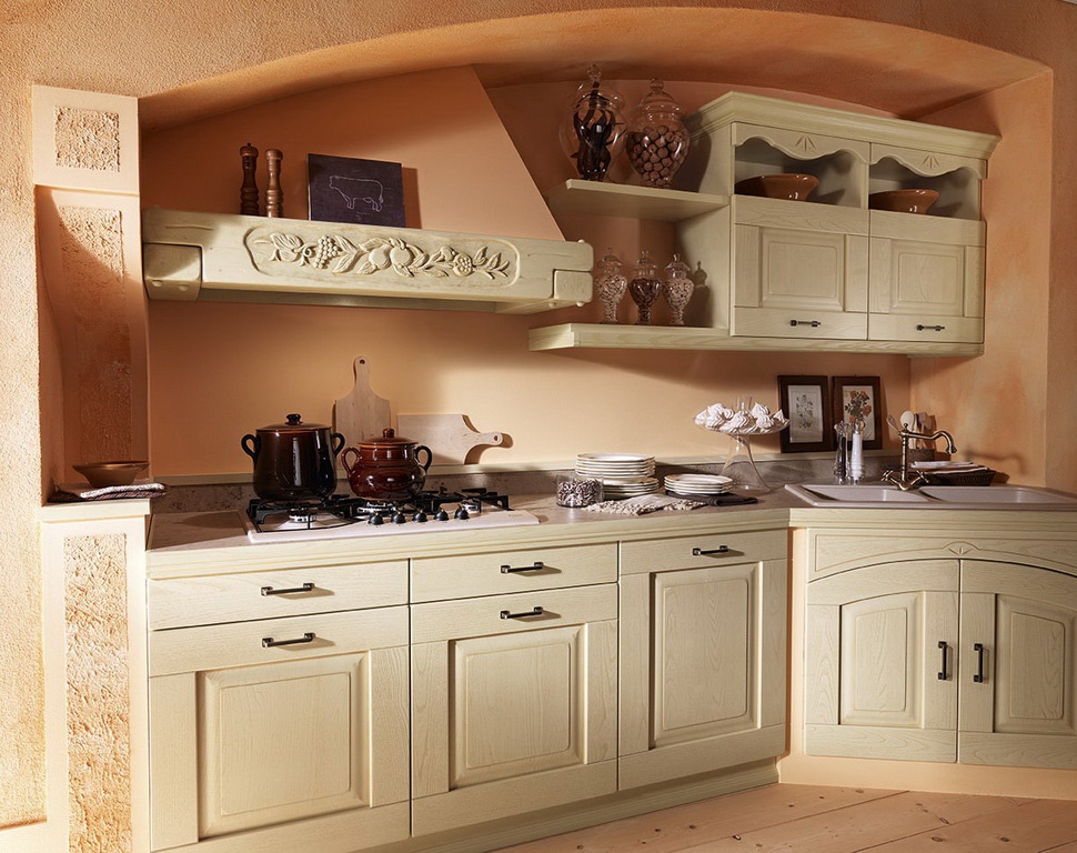 Kitchen from Italian manufacturer Astra. Set is made of solid wood. Fitted wall and floor cabinets. Blind doors and glass. Color headset dairy. A style classic.