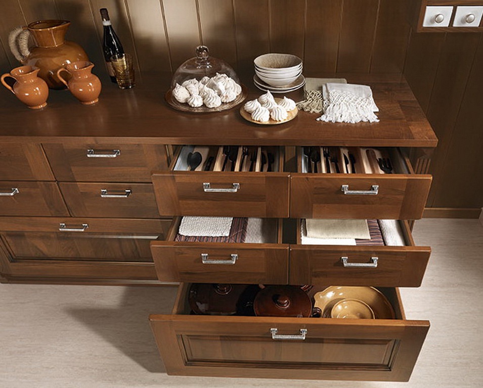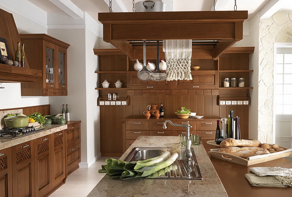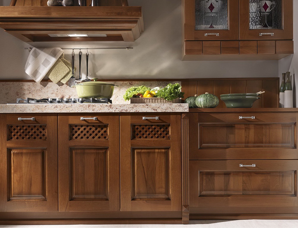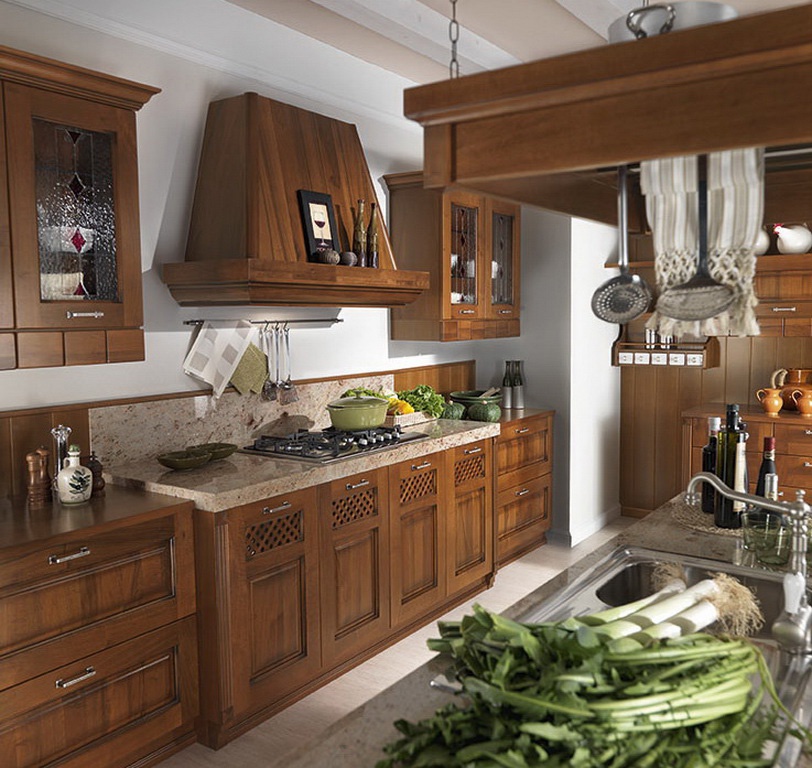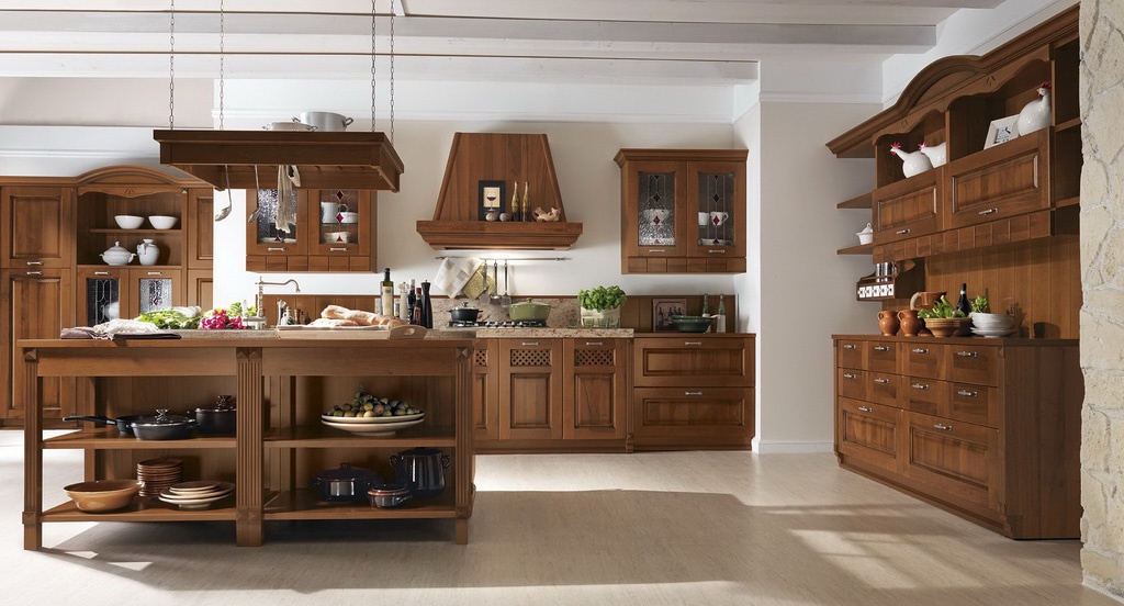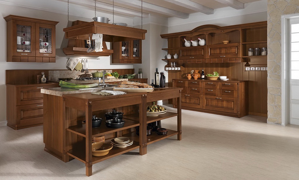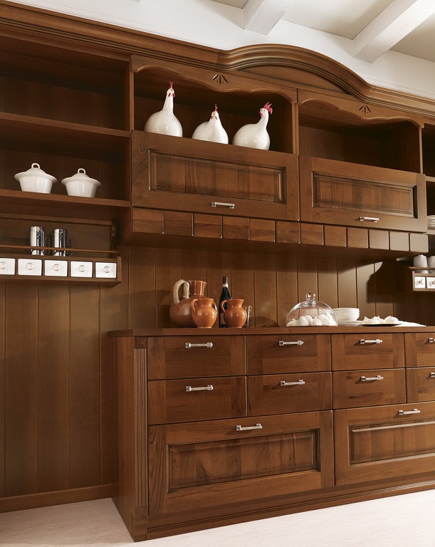 Kitchen from Italian manufacturer Astra. Set kitchen Islands made from solid wood. Equipped with drawers and shelves. Blind doors and glass. Headset color dark natural wood. A style classic.