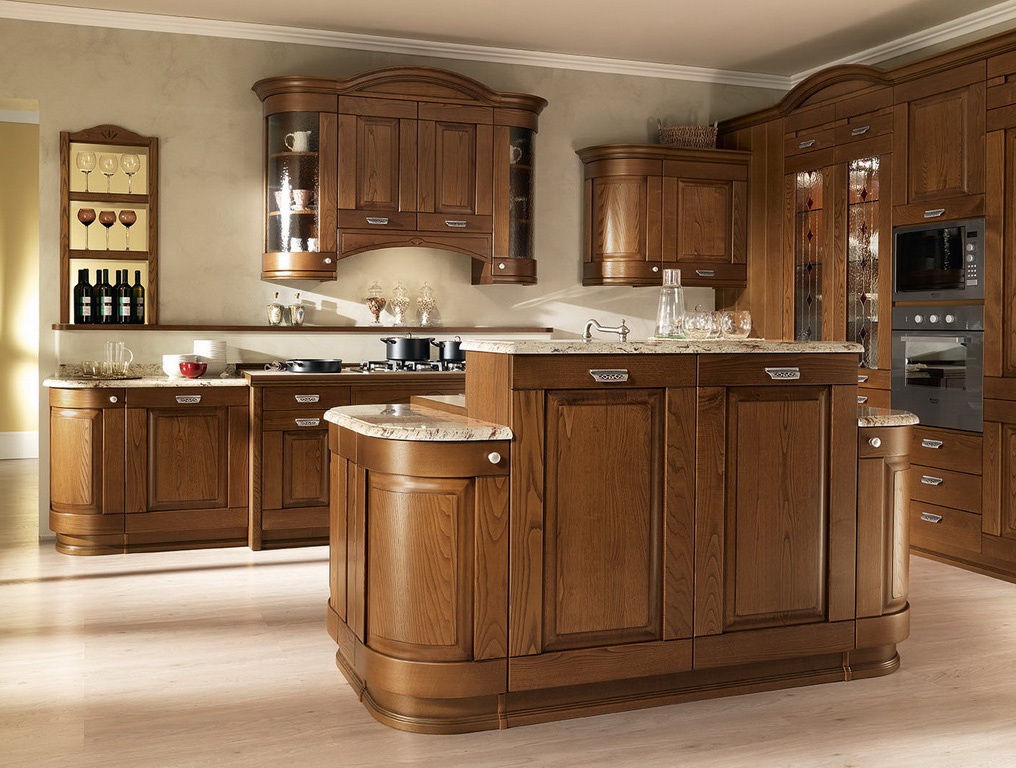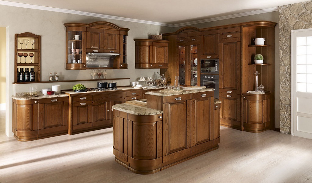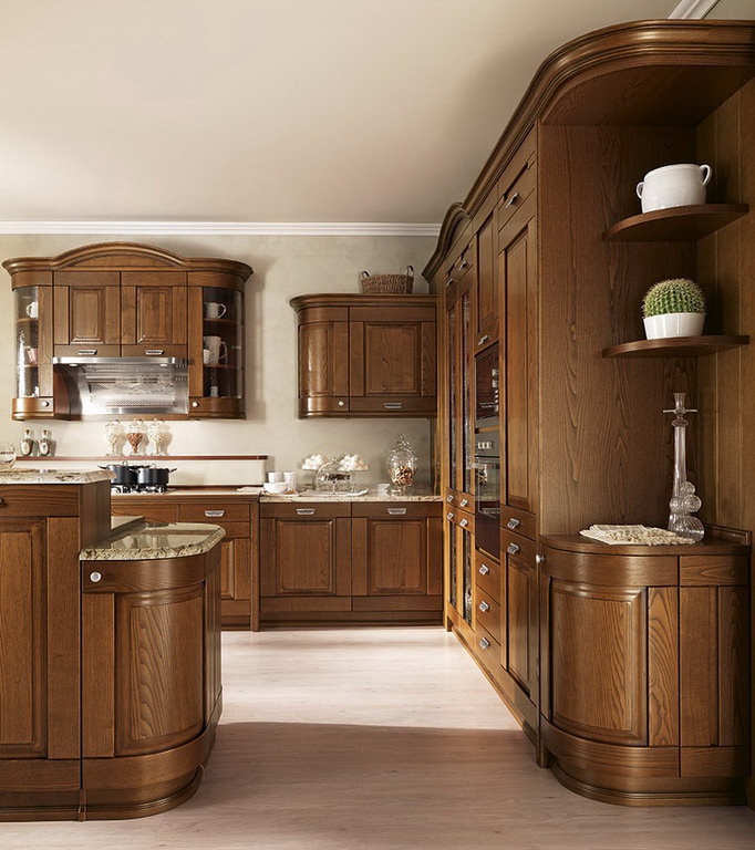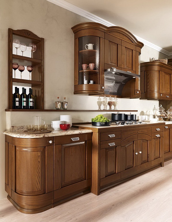 Kitchen cabinets are from Italian manufacturer Astra. Presented set is made of solid wood. Equipped with drawers and shelves. Blind doors and glass. Top hinged lockers with semi-circular doors. Headset color of natural wood. Set executed in classical style.