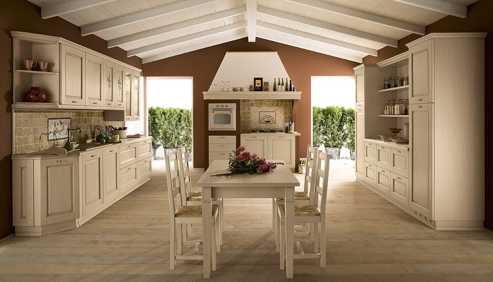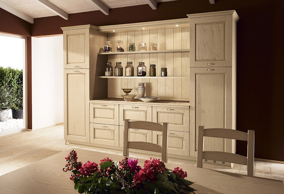 Kitchen from Italian manufacturer Astra. Set is made of solid wood. Equipped with many convenient lockers with hinged doors, drawers and shelves. Blind doors and glass. Headset color white. A style classic.