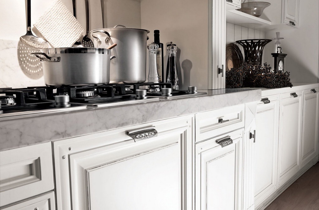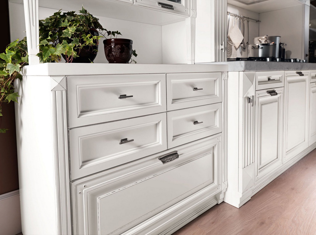 Kitchen Pegaso from the Italian manufacturer Astra. Set is made of solid wood. Equipped with comfortable cabinets with hinged doors, drawers and shelves. Headset white color in contrast with the black island. A style classic.