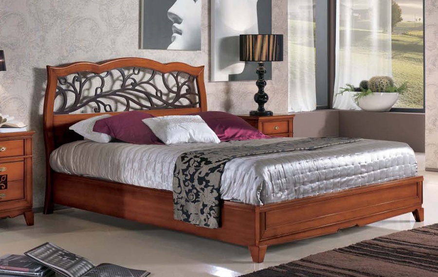 Double bed from Italian manufacturer Marchetti. High bed with decorative headboard. The frame is made of solid walnut. Colors light and dark colors of wood. A style classic.