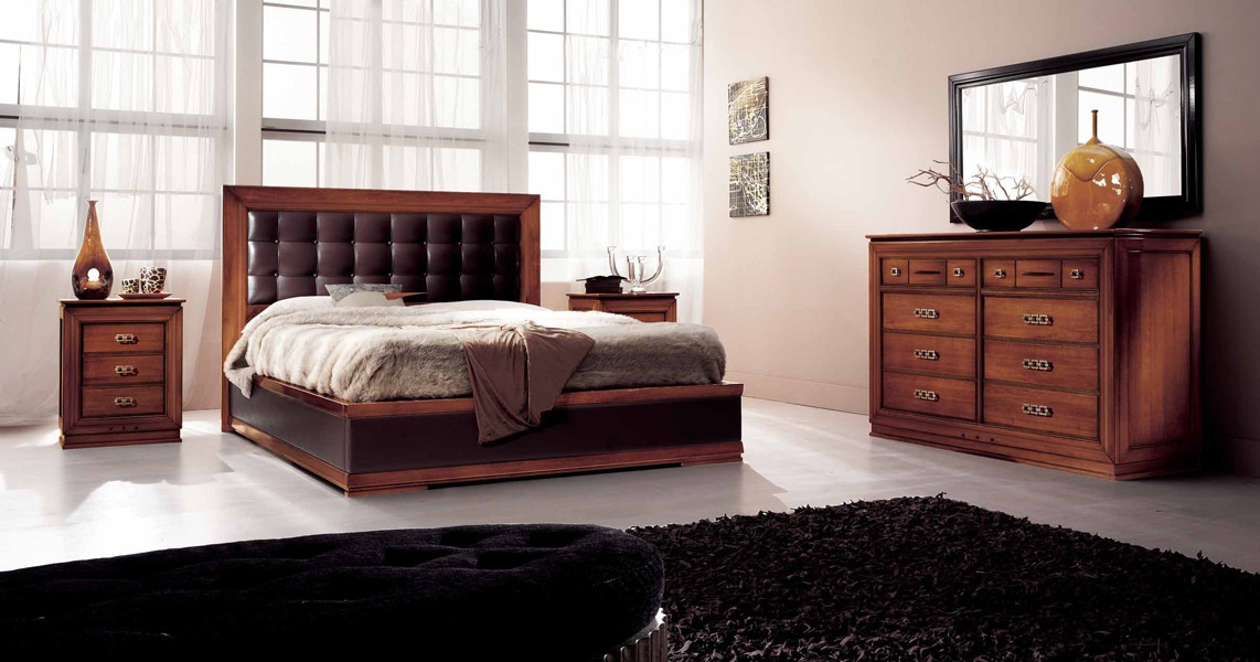 Headsets for bedrooms from Italian manufacturer Marchetti. The presented model of a double bed, bedside tables and chest of drawers. Bed with high headboard upholstered in leather of black color.