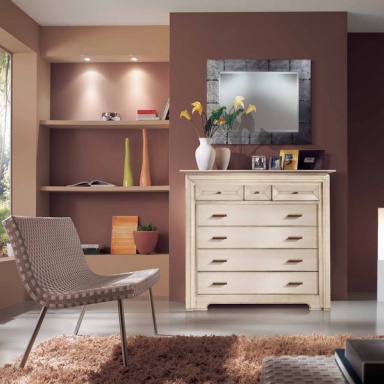 A chest of drawers from Italian manufacturer Marchetti. A chest of drawers on small feet made of natural wood, equipped with drawers. Color beige version. A style classic.