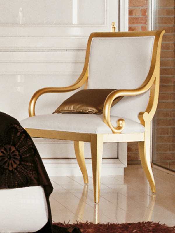Klimt chair from Italian producer Luciano Zonta. Armchair with soft back and hard armrests. The frame is made from solid wood covered in gold foil. Seat upholstery option textile white. The chair is made in a classic style.