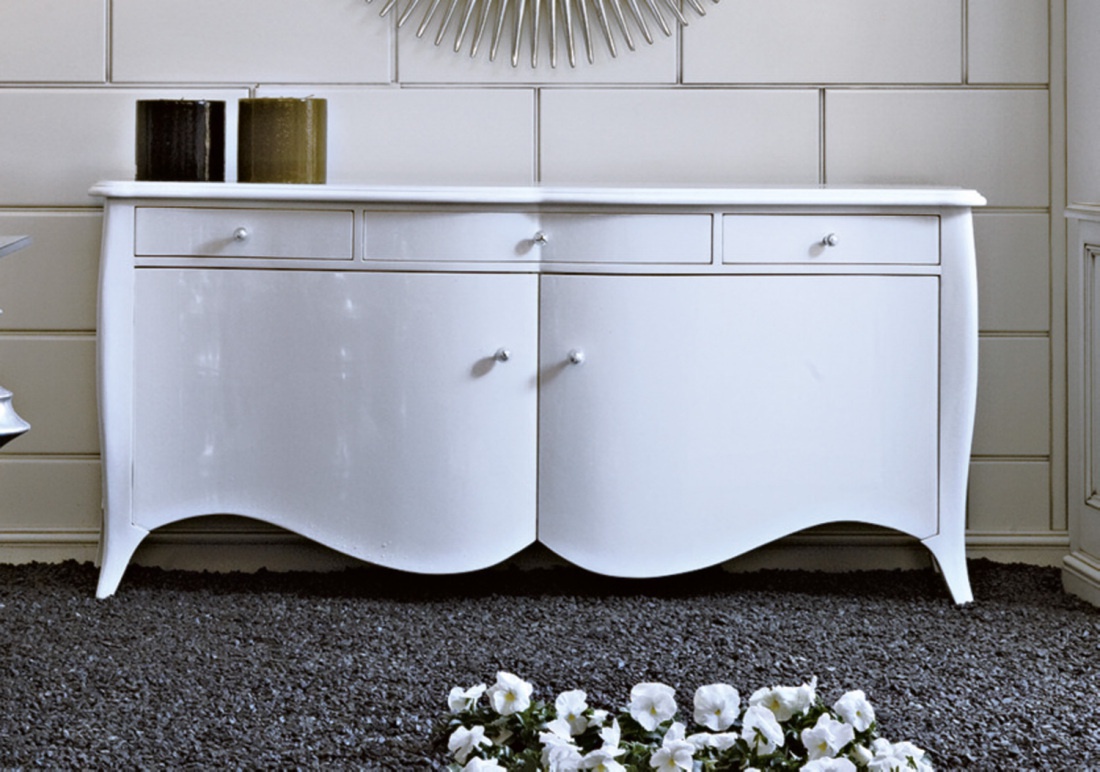 A snack bar Versalles from the Italian producer Luciano Zonta. Model with drawers and hinged doors. The doors at the bottom have figured framing. The frame is made from solid wood. Lacquered white. Made in art Deco style.