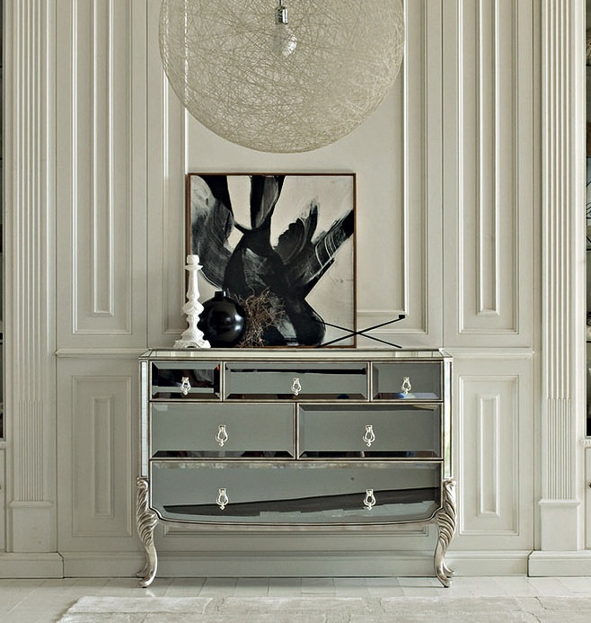Dresser Mirror from the Italian producer Luciano Zonta. A chest of drawers on short curly legs. The frame is made from solid wood. The frame is covered with silver foil. The facades of the mirrored boxes. Made chest of drawers in art Deco style.