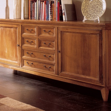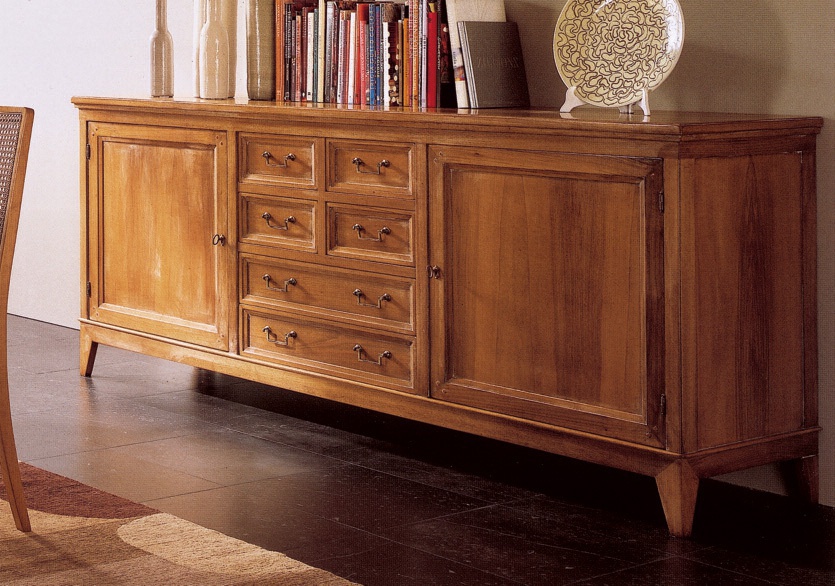 Buffet Agora from the Italian producer Luciano Zonta. Presents a chest of drawers on small feet. The frame is made from solid walnut wood, treated with varnish. Equipped with pull-out drawers in the center and two cupboards with hinged doors on the sides. Handles are metal. A snack bar is made in classic style.