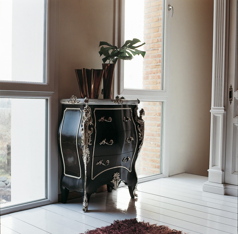 A chest of drawers from the Italian Tintoretto Luciano Zonta manufacturer. The dresser is made from solid wood. Equipped with pull-out drawers. The case is decorated with hand-carved, covered with silver foil. Performed a chest of drawers in the Baroque style.