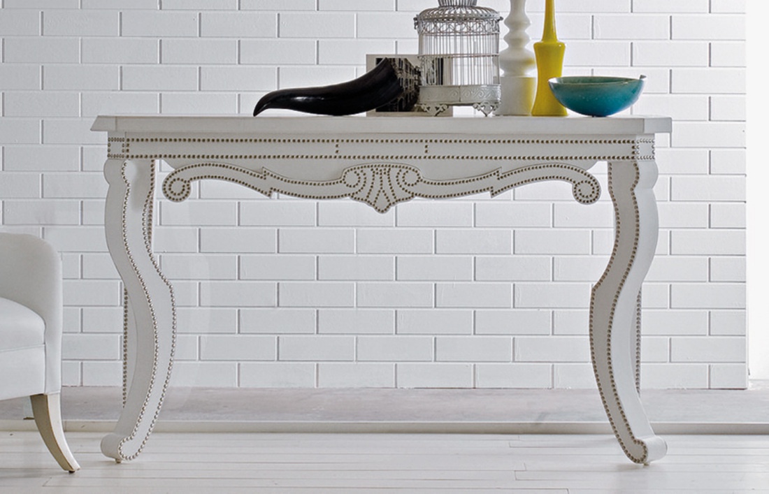 Console Mythos from the Italian producer Luciano Zonta. The frame is made from solid wood. Model rectangular high console on figured legs. Lacquered white with the effect of aging. Made in the style of art Deco.